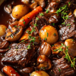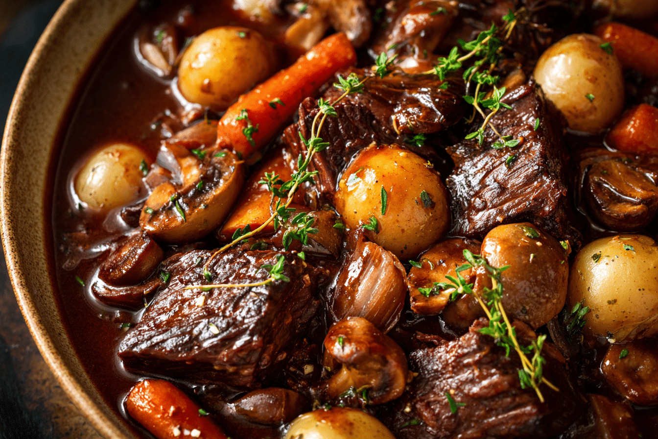 A rich and comforting French-style beef stew slowly braised in red wine with bacon, carrots, mushrooms, and herbs.