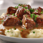 Beef Tips and Gravy Stovetop Recipe Restaurant Quality Dinner is perfect for busy weeknights when you want a complete, home-cooked meal without spending the entire evening at the stove. Served over mashed potatoes, rice, or buttered noodles, it is simple, satisfying, and packed with bold flavor.