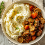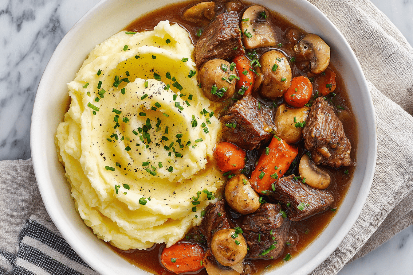 Beef Bourguignon, also known as Boeuf Bourguignon, is a timeless French stew that transforms humble ingredients into something rich, elegant, and deeply comforting. Originating from the Burgundy region of France, this dish is all about slow braising — where chunks of beef simmer in red wine with aromatic vegetables, herbs, and smoky bacon until melt-in-your-mouth tender.