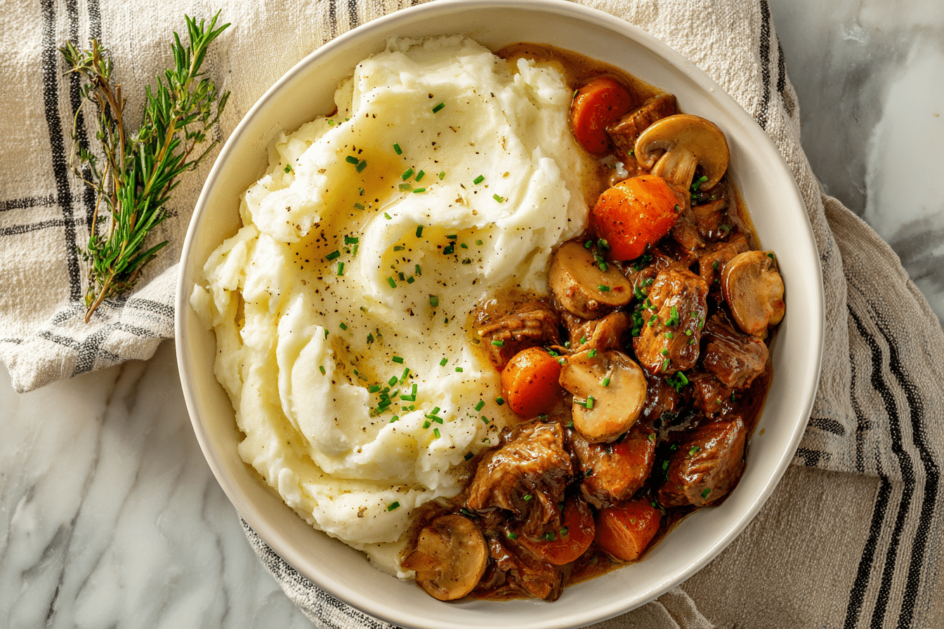 • Red Wine (Burgundy or Pinot Noir): Wine is the soul of this dish. A dry, medium-bodied red like Pinot Noir or Côtes du Rhône adds depth and a slight acidity that balances the richness of the beef.