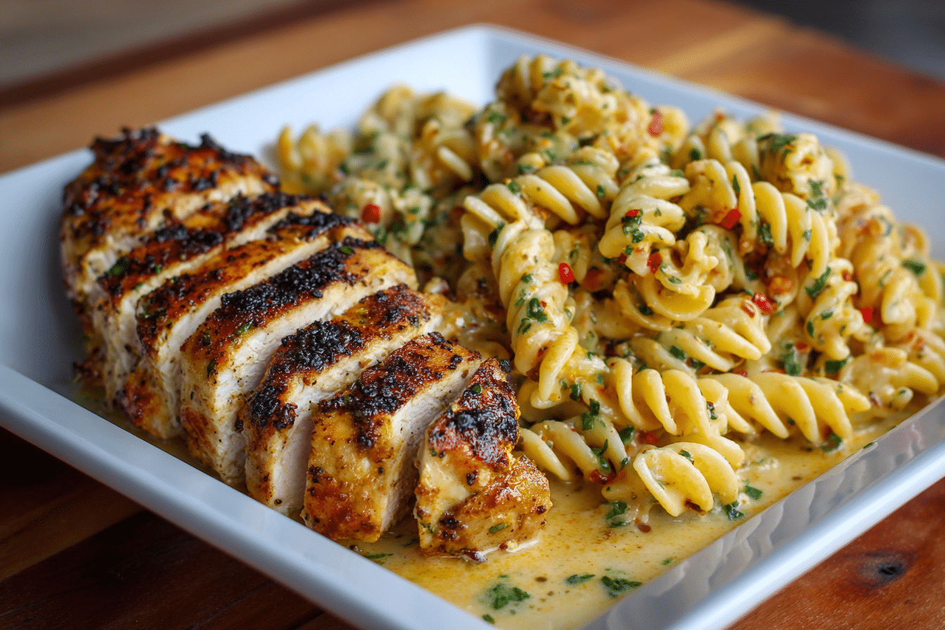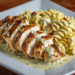 Juicy, seared chicken simmers in a luscious garlic Parmesan cream sauce, soaking into tender pasta with every bite. The flavors are simple yet bold—savory garlic, buttery richness, and nutty cheese combine into a silky coating that clings to every strand of pasta.
