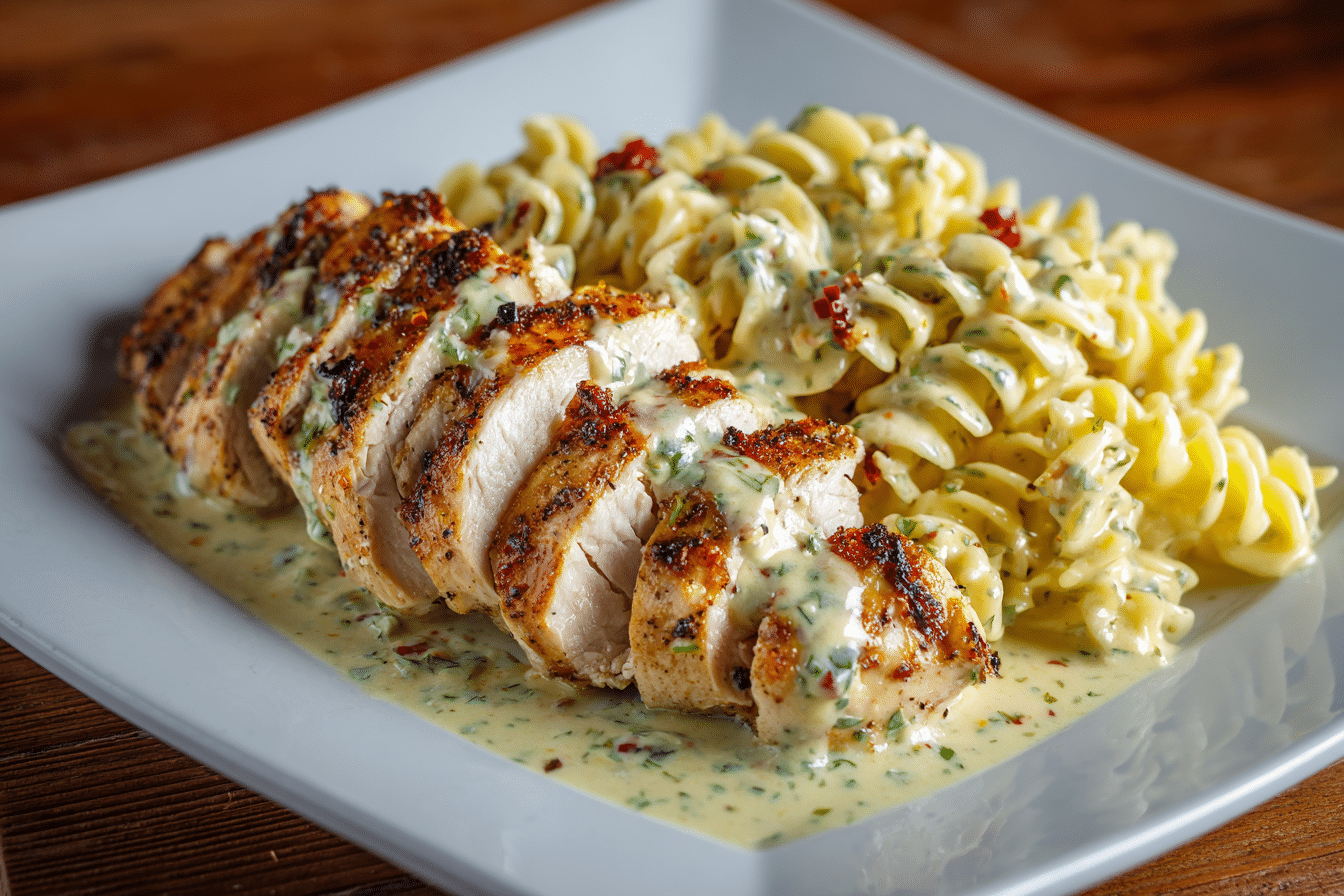 Juicy, seared chicken simmers in a luscious garlic Parmesan cream sauce, soaking into tender pasta with every bite. The flavors are simple yet bold—savory garlic, buttery richness, and nutty cheese combine into a silky coating that clings to every strand of pasta.
