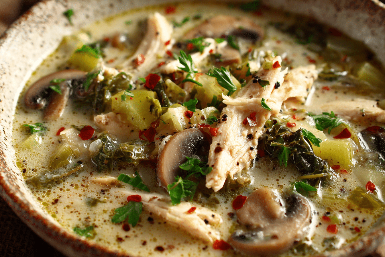 A rich, comforting soup made with rotisserie chicken, sautéed mushrooms, herbs, and a touch of cream — ready in just 30 minutes.