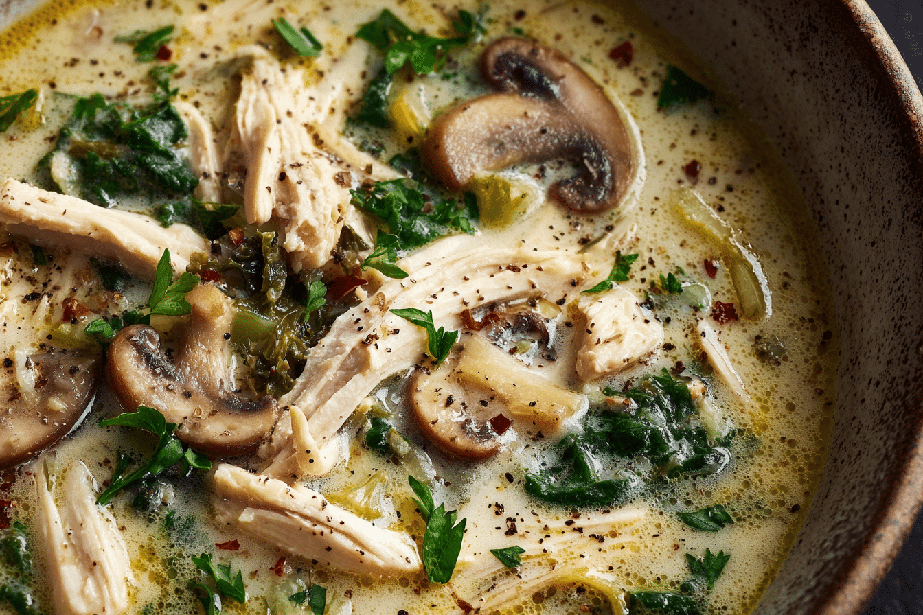 A rich, comforting soup made with rotisserie chicken, sautéed mushrooms, herbs, and a touch of cream — ready in just 30 minutes.