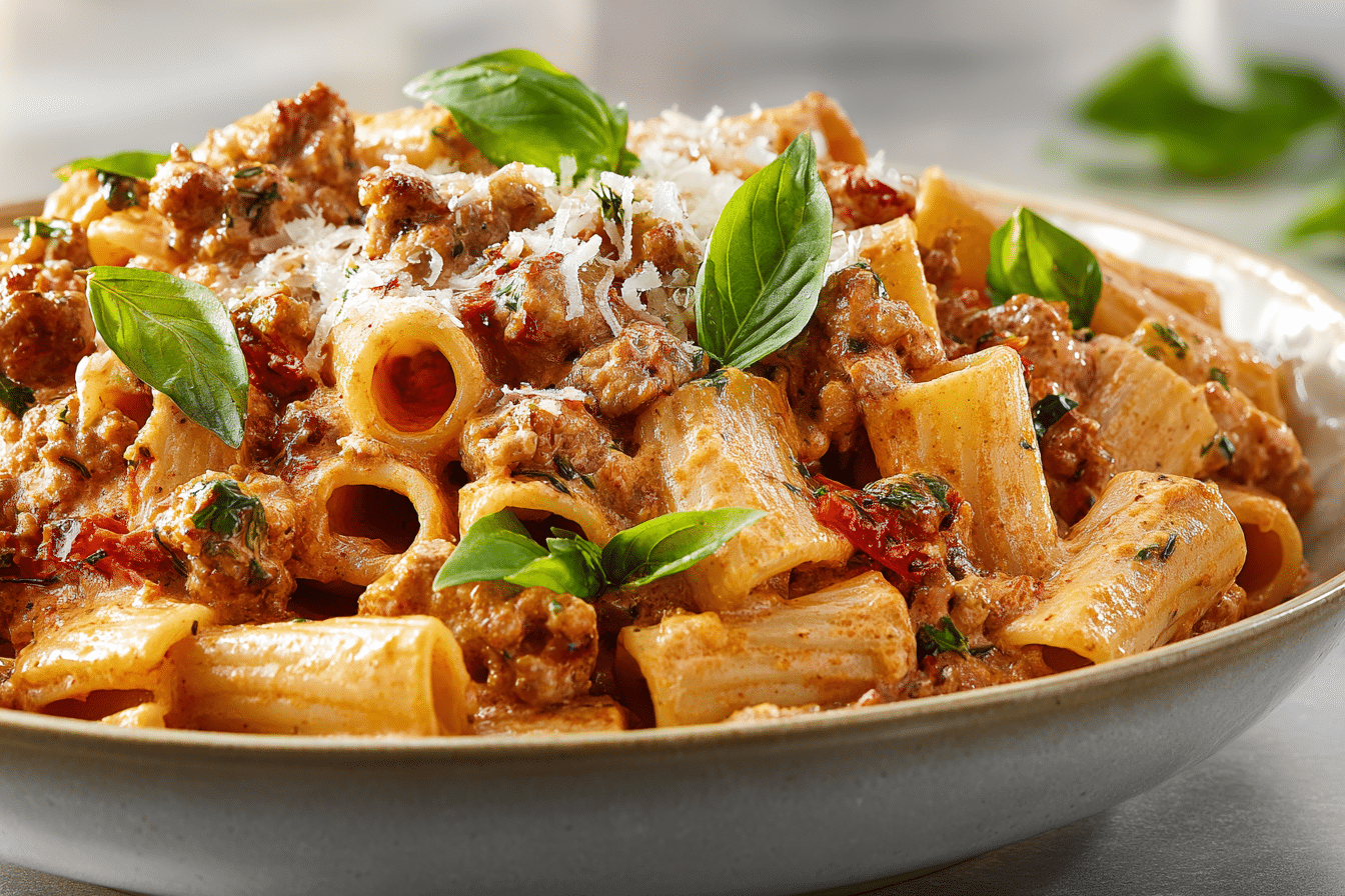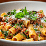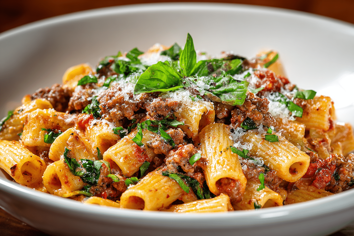 Creamy sausage rigatoni is a rich, savory pasta dish made with crumbled Italian sausage, tomato sauce, and a splash of cream. It’s simple to make and packed with comforting flavor.