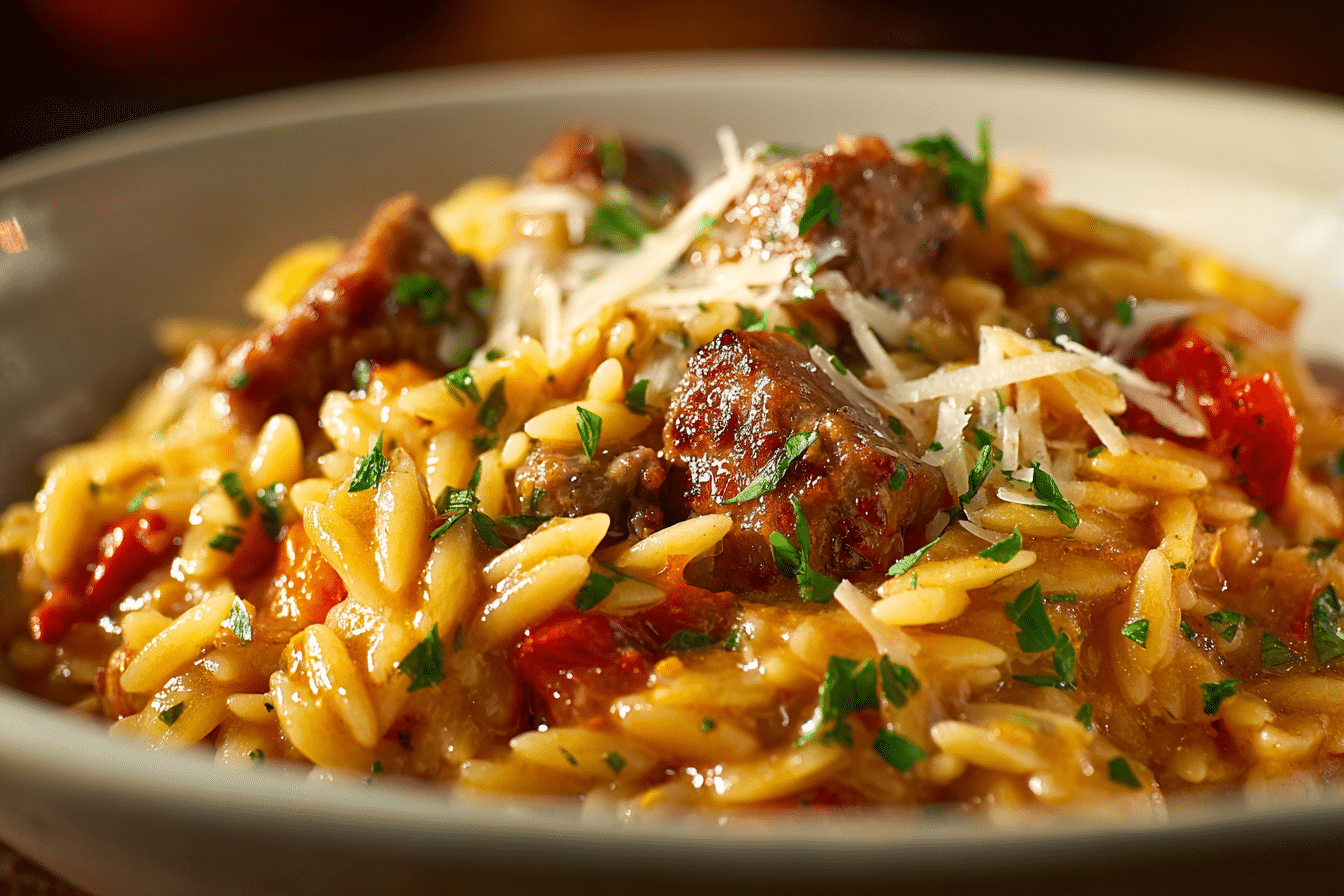A creamy one-pan pasta dish made with smoky sausage, tender orzo, and a tomato-infused cream sauce. Fast, hearty, and full of flavor.
