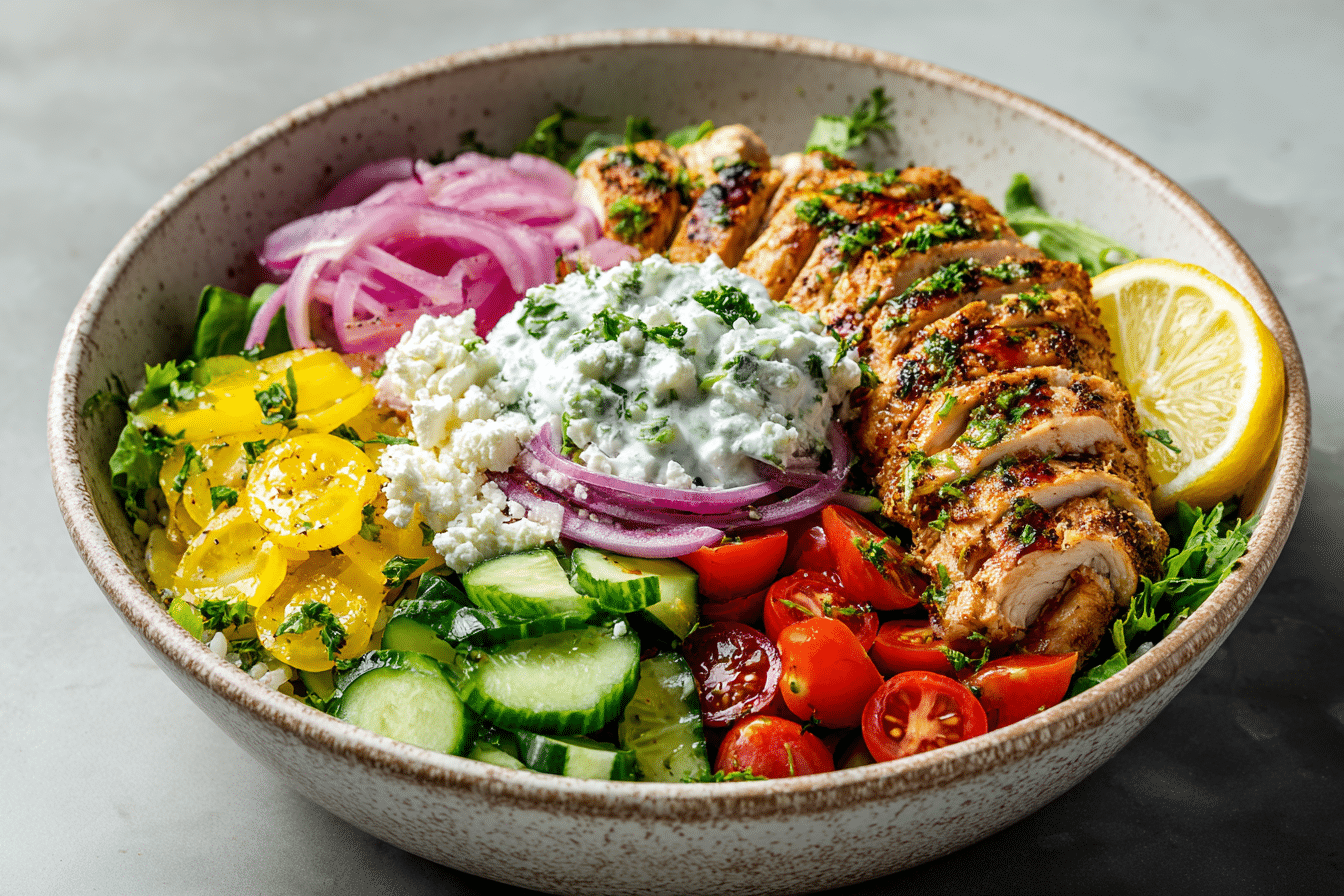 Greek Chicken Bowls are a fresh, Mediterranean-inspired meal featuring lemon-herb grilled chicken, grains, tzatziki, and colorful veggies — perfect for meal prep or weeknight dinners.