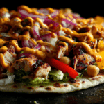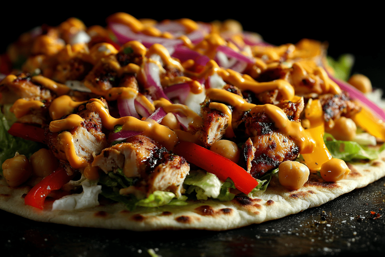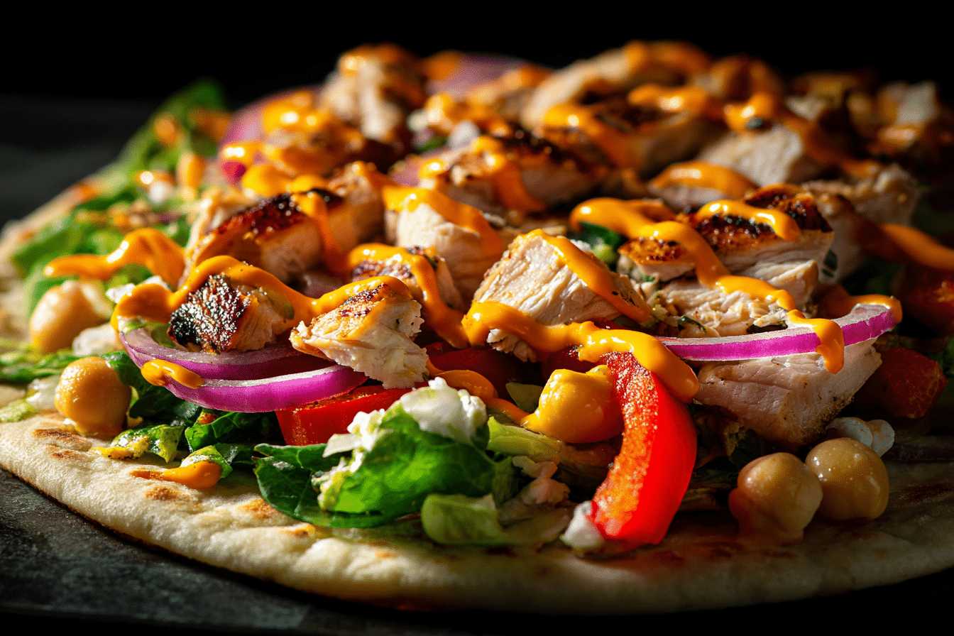 A crispy, cheesy flatbread topped with juicy grilled chicken, fresh veggies, and flavorful sauces — quick to make, easy to customize.