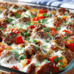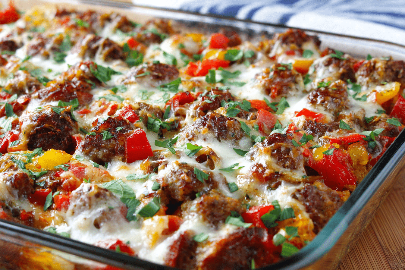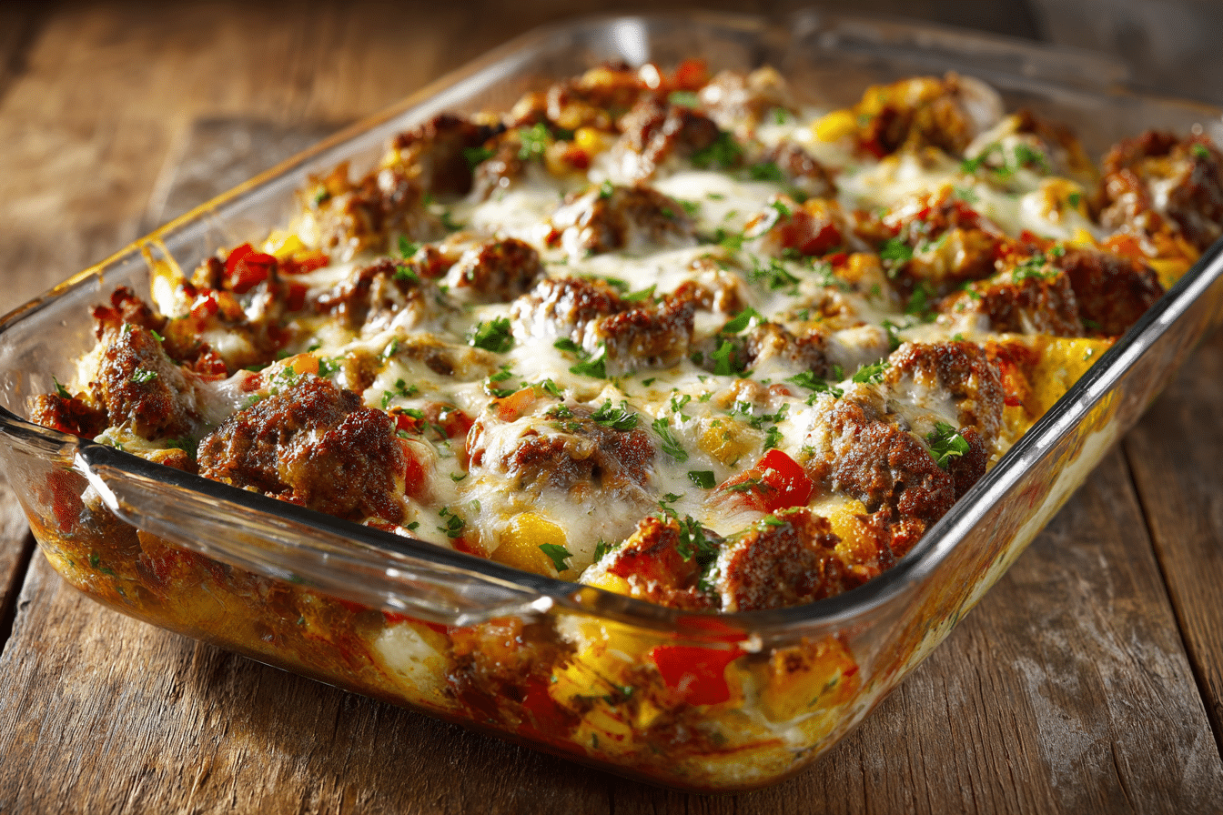 A hearty baked casserole with Italian sausage, sweet bell peppers, marinara sauce, and melted cheese — a cozy and flavorful family meal.