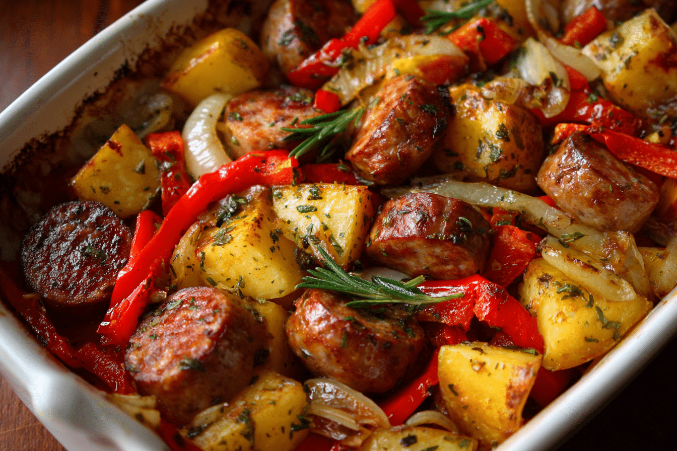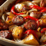 The appeal of this casserole lies in its balance. Savory sausage provides depth, peppers add sweetness, and tomatoes bring gentle acidity. As it bakes, the vegetables soften and the sauce thickens slightly, coating every bite. The result feels filling and grounding, suited to shared meals around the table.