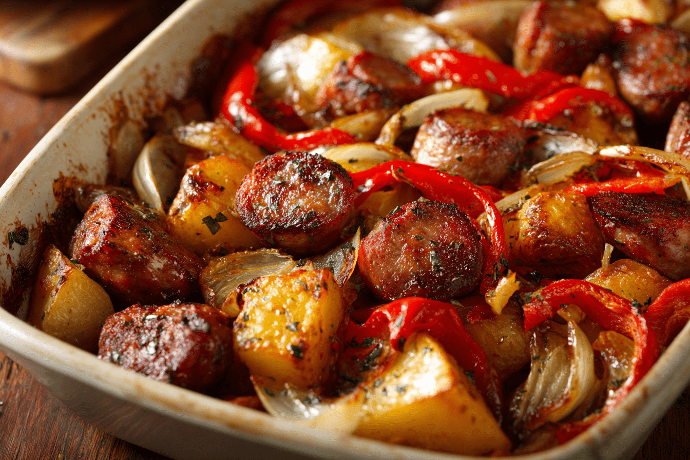 Baked Italian sausage with peppers, onions, and tomato sauce prepared as a hearty casserole.
