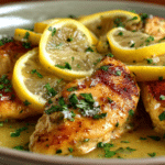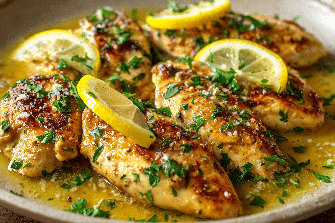 Pan-seared chicken breasts simmered in a silky, bright lemon butter sauce with garlic, broth, and a hint of cream. Perfect for pasta, rice, or vegetables.
