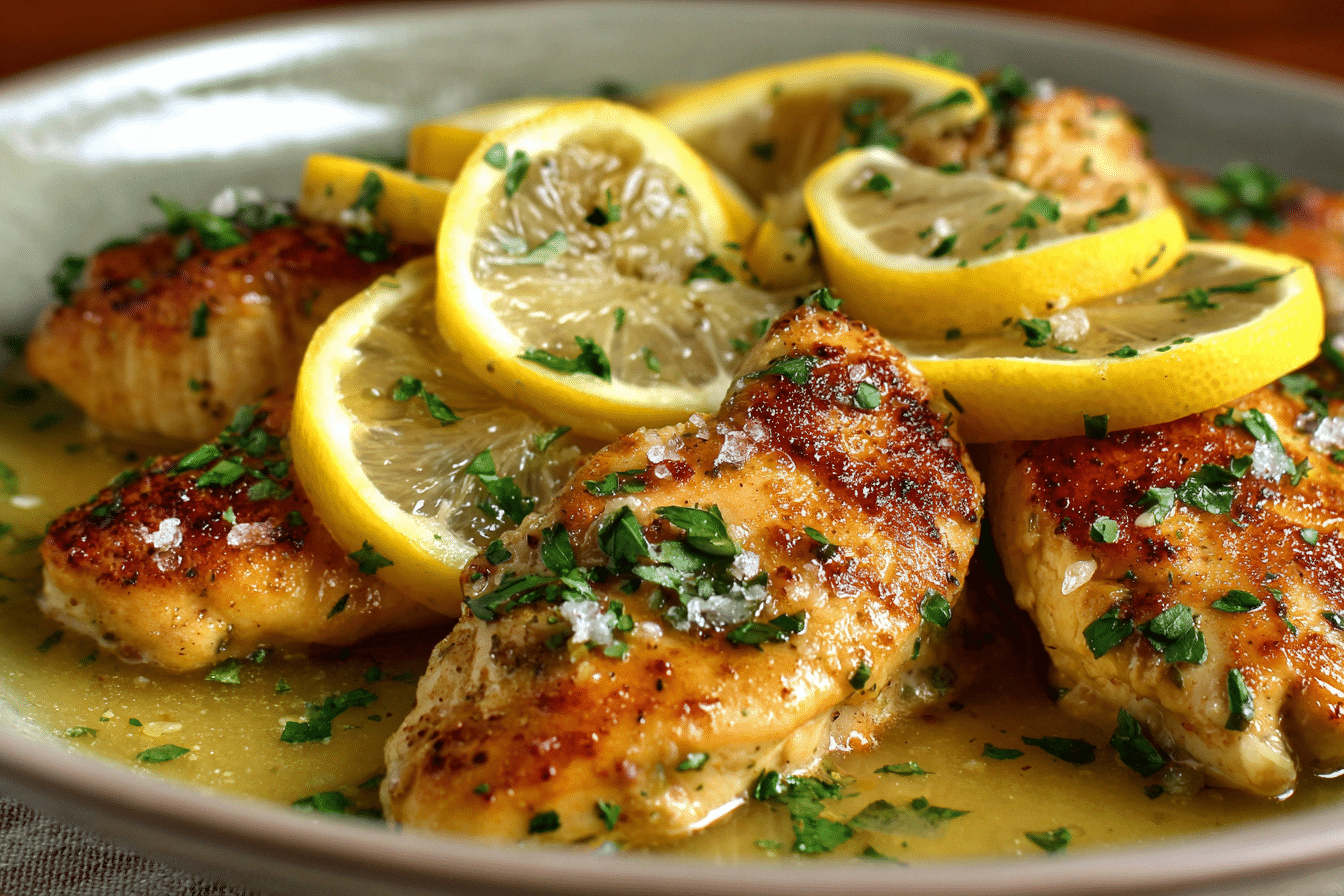 Pan-seared chicken breasts simmered in a silky, bright lemon butter sauce with garlic, broth, and a hint of cream. Perfect for pasta, rice, or vegetables.