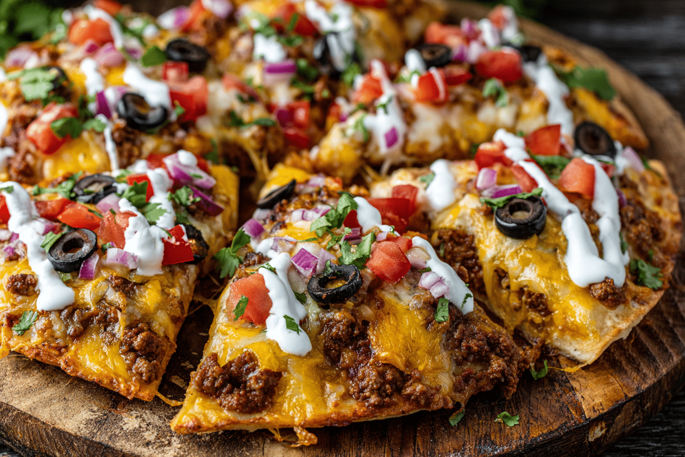 This Taco Bell-style Mexican pizza features layers of crispy tortillas, seasoned ground beef, refried beans, melty cheese, and classic toppings. A quick, bold Tex-Mex dinner that’s fun, fast, and family-approved.