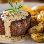 Filet Mignon with Creamy Peppercorn Sauce is a timeless steakhouse classic — tender, buttery filet seared to perfection and finished with a velvety pan sauce rich with cream, brandy, and bold cracked peppercorns. It’s a luxurious yet simple dish that turns any dinner into a special occasion.