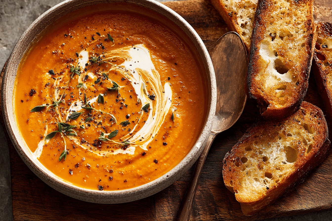 Roasted Vegetable Soup: Smooth and Creamy features caramelized vegetables blended into a velvety, comforting bowl of flavor.