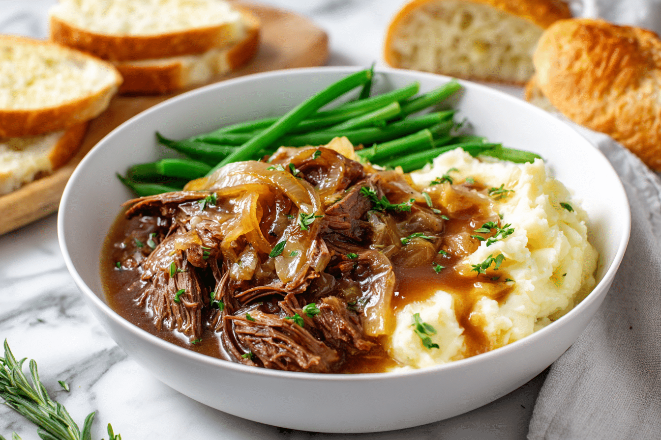 A melt-in-your-mouth slow cooker pot roast infused with French onion soup flavors — caramelized onions, garlic, herbs, and melted cheese — perfect for cozy dinners.