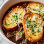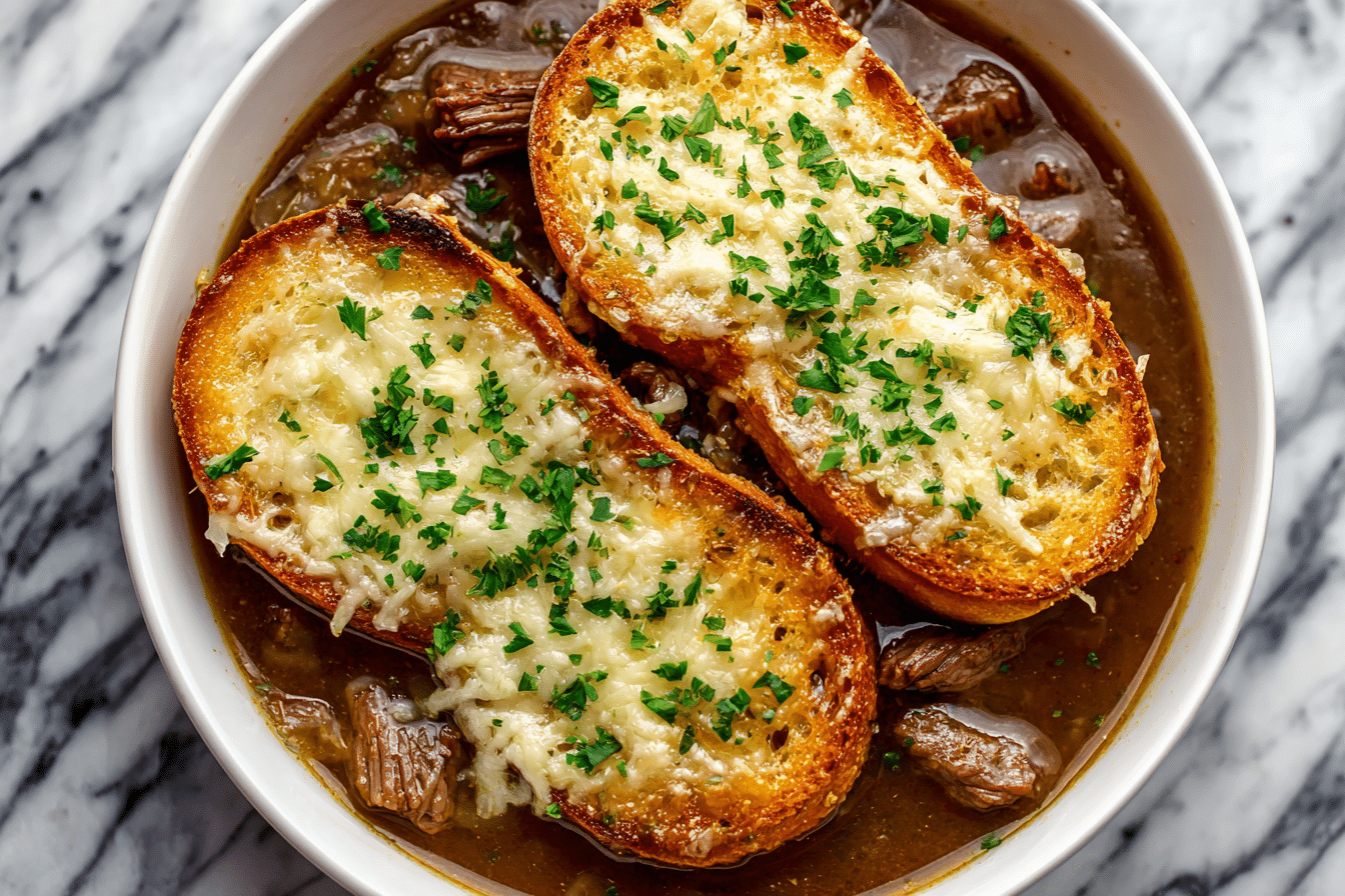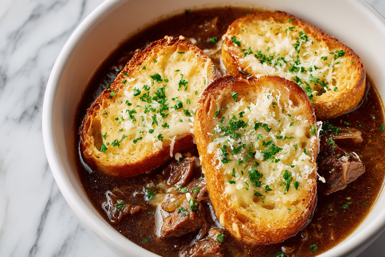 A rich, slow-simmered stew that combines tender beef, deeply caramelized onions, and a savory red wine broth — optionally topped with melty gruyère toast for a French twist.