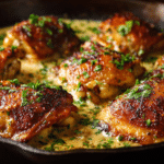 Bobby Flay’s Skillet Chicken Thighs in a Dreamy Creamy Garlic Sauce brings together crisp golden skin, juicy dark meat, and a velvety pan sauce that feels both comforting and refined. This dish balances deep savory notes with gentle garlic warmth, all created in a single skillet.