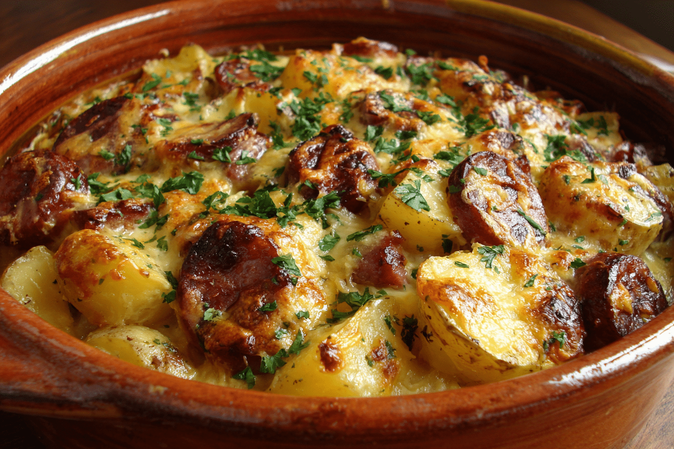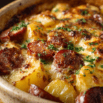 A hearty baked dinner with smoky sausage, crispy potatoes, caramelized onions, and melted cheese — all in one comforting, easy-to-make dish.