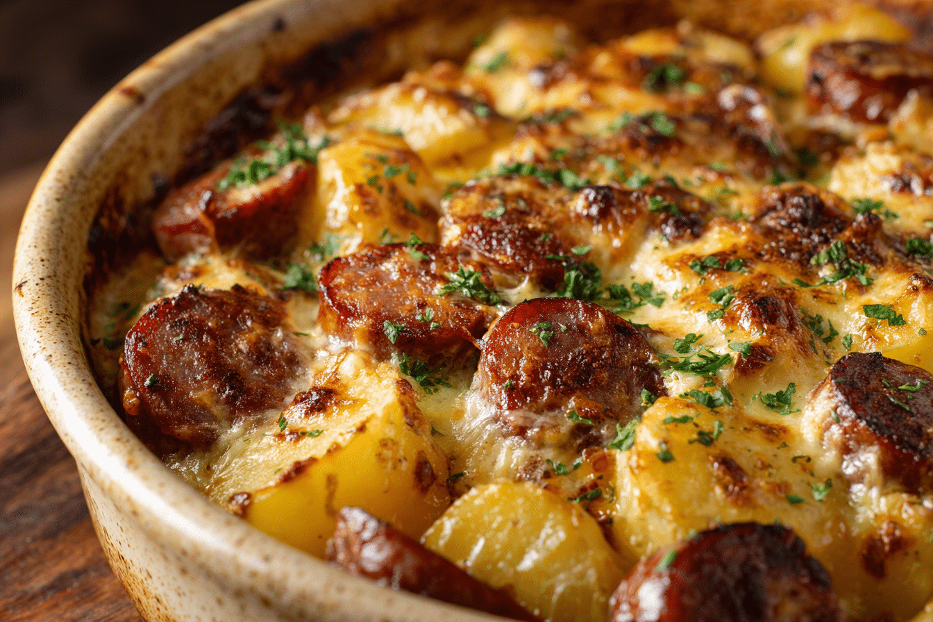 A hearty baked dinner with smoky sausage, crispy potatoes, caramelized onions, and melted cheese — all in one comforting, easy-to-make dish.